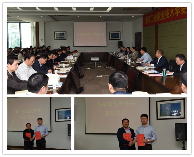 3月29日下午,南京工业职业技术学院安全稳定工作责任书签订大会在行政楼辅二楼会议室召开。校领导吴学敏、谢永华、苏小冬、于林惠、霍雄飞、朱建国、崔新明出席会议,全校中层干部参会。会议由党委副书记、校长谢永华主持。