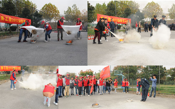 在灭火演练中,保卫处消防科准备了干粉灭火器、燃烧桶等物品,吴冬奇科长现场指导学生、物管和公寓管理员正确使用灭火器的方法和火场逃生的要领。经过消防安全演习大家掌握了扑灭火焰的方法和火场紧急逃生的技能。