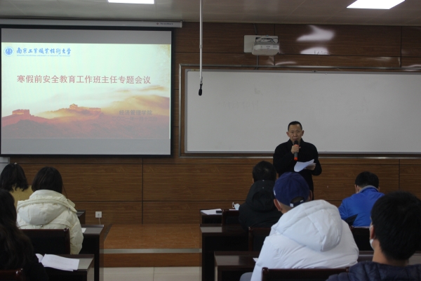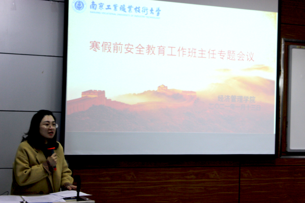 1月13日中午,经济管理学院在乐业楼314会议室召开寒假前安全教育工作班主任专题会议,学院党总支书记陈林杰、党总支副书记黄滢以及全体辅导员和班主任老师参加了本次会议,会议由黄滢主持。
